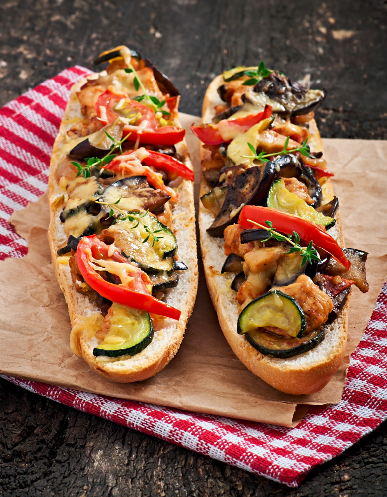 Pan crujiente relleno de pollo, jamón y queso o vegetales frescos.