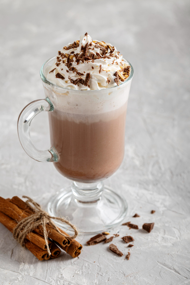 Leche caliente con chocolate cremoso, decorado con crema batida y cocoa.