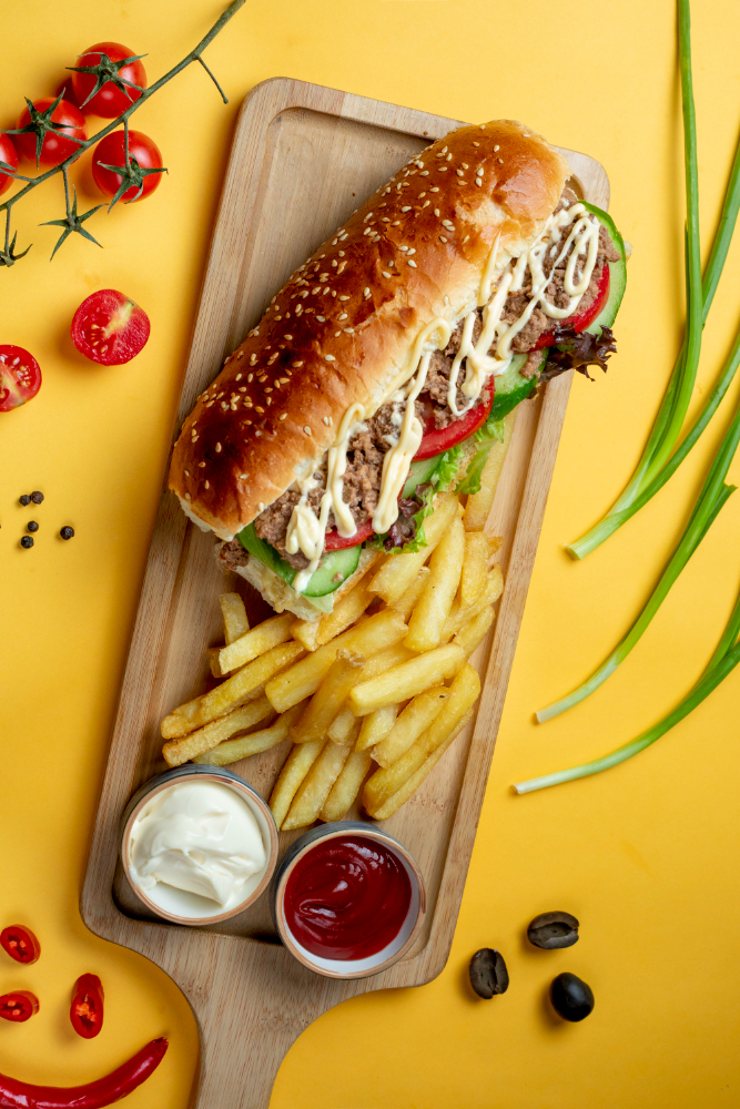 Carne jugosa en pan suave con ingredientes frescos.